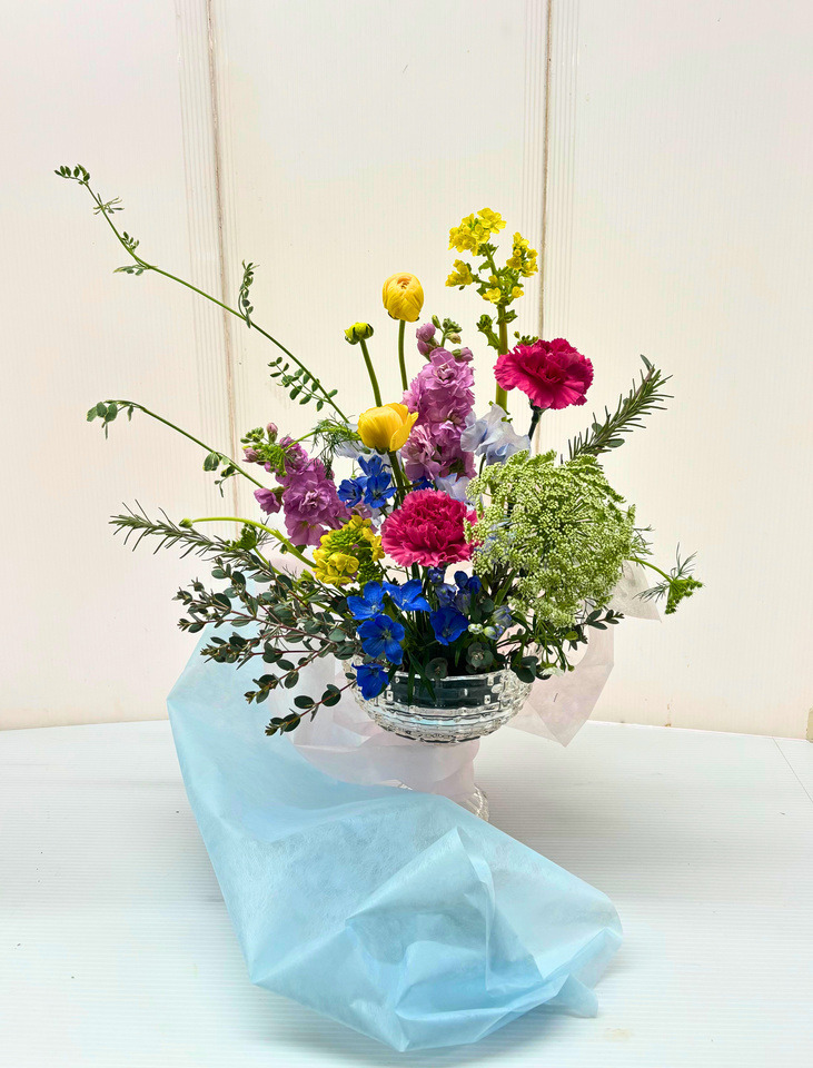 持ち帰りやすいように、カラーペーパーでキャンディ型のアレンジメントを制作しました。